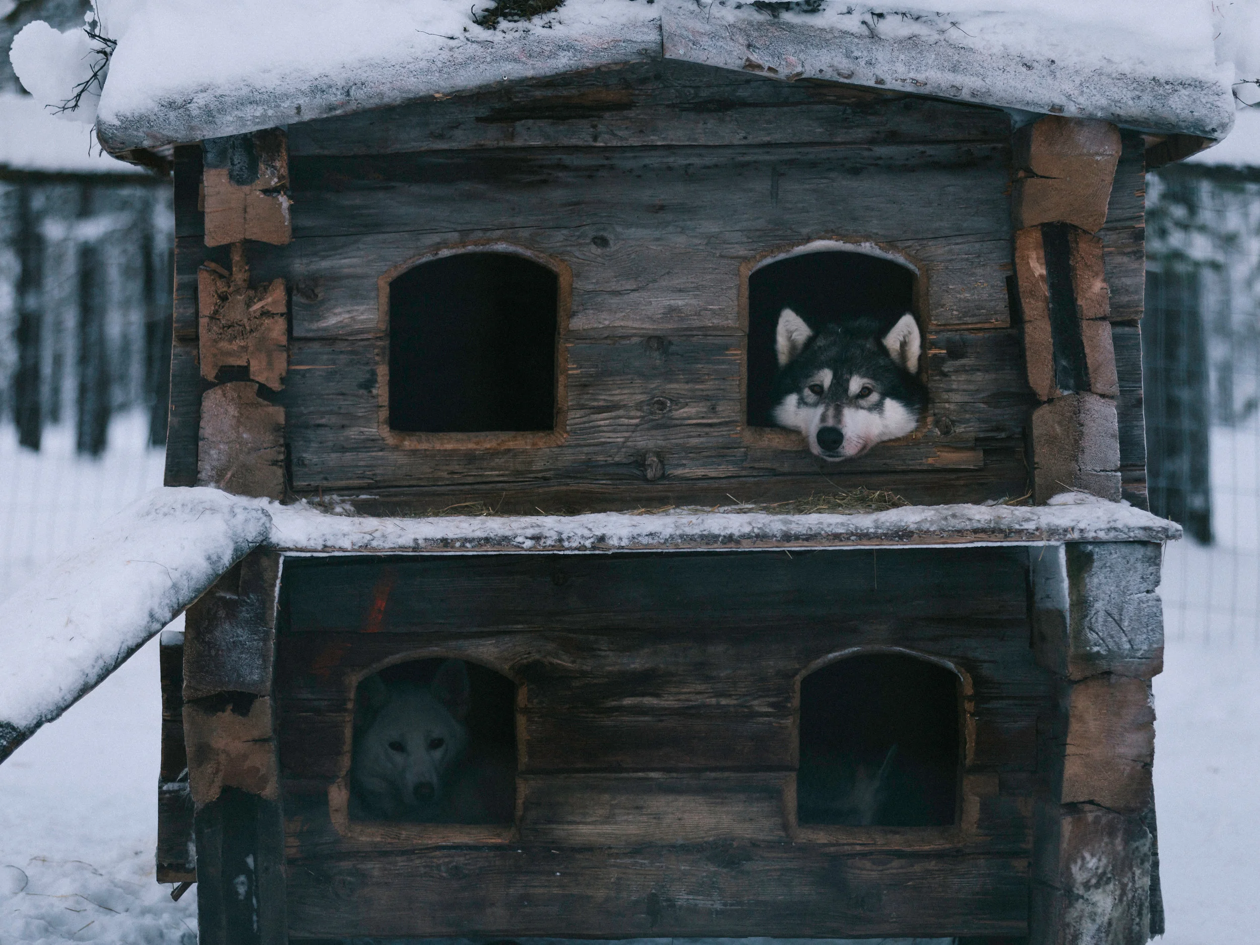 Their livelihood depends through a dedicated dog sledding business that Tinja has been managing for the past 11 years. They divided the workload between them such that Tinja looks after the Siberian Huskies, Greenland Dogs and Wolf dogs, while Alex cares for the Alaskan Huskies. Unlike other commercial sledding businesses in central Lapland, the couple offers a more demanding and authentic safari experience. Visitors have to meander and traverse through the untouched wilderness of Northern Lapland, mushing through deep snow, and having lunch over a campfire in the woods. Their business is well supported by the closely knitted local community. The food for the dogs are supported by the local fisherman and reindeer herder, who were touched by the rescue efforts that the farm provides to mistreated animals.